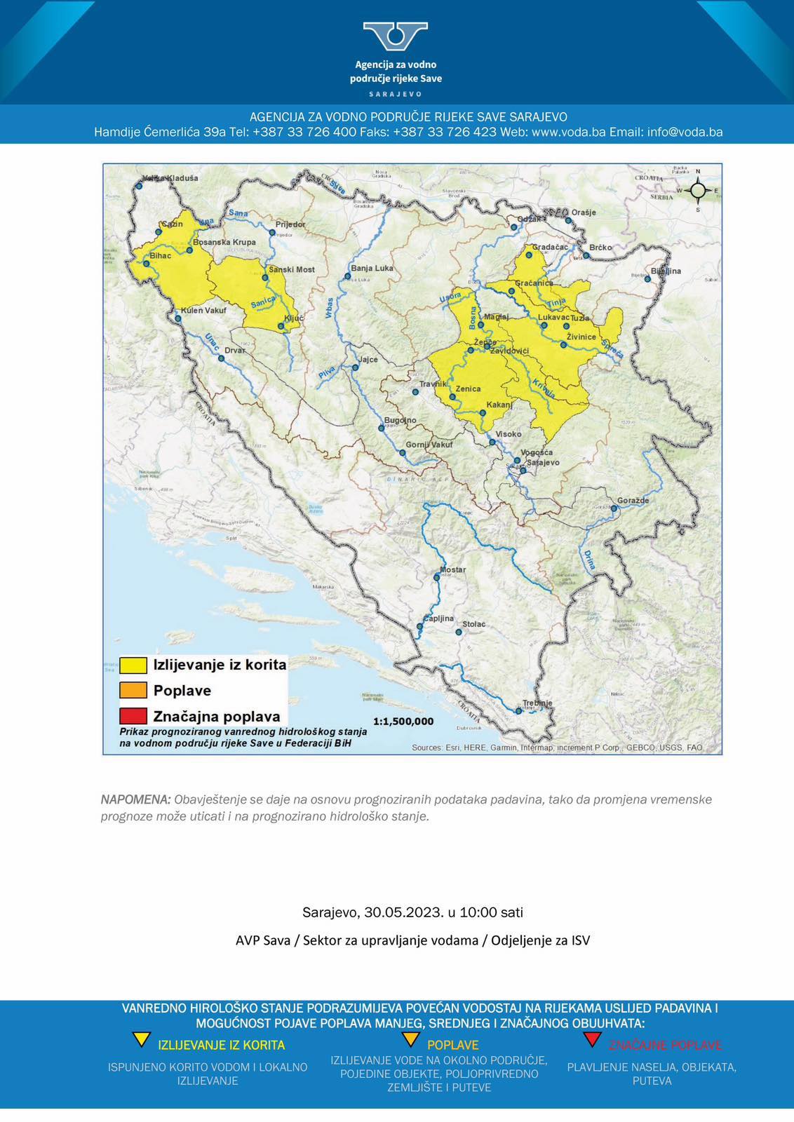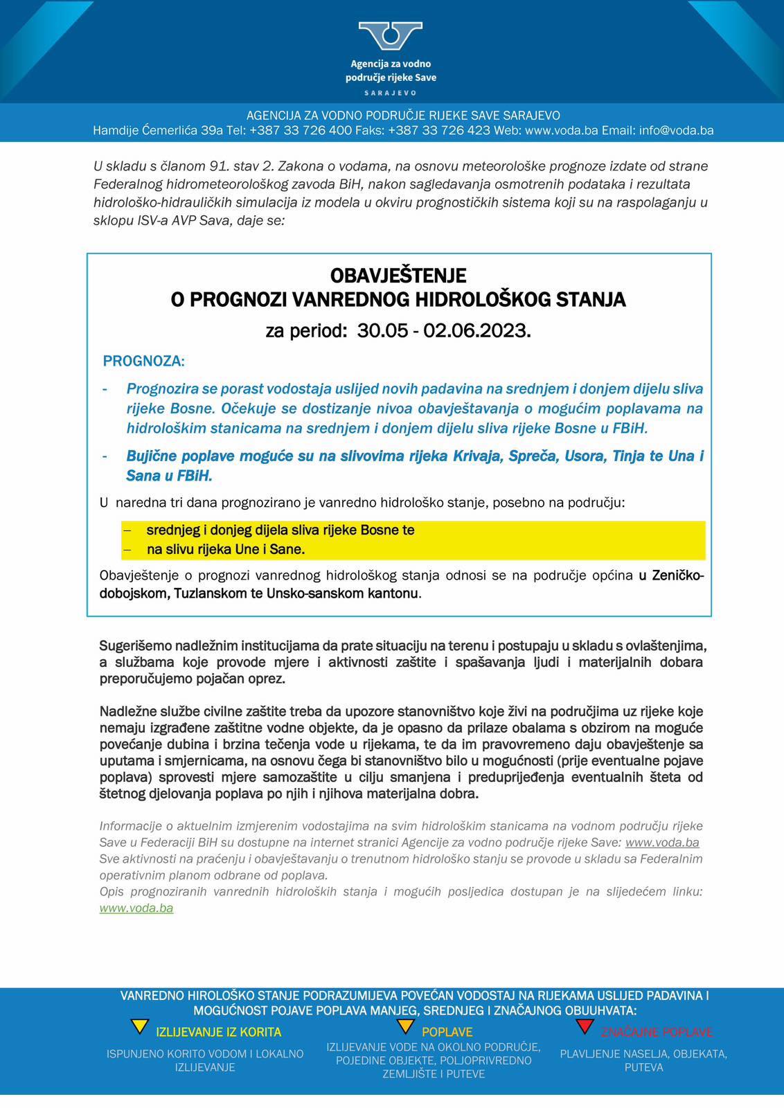 Obavještenje o prognozi vanrednog hidrološkog stanja odnosi se na područje općina u Zeničkodobojskom, Tuzlanskom te Unsko-sanskom kantonu.